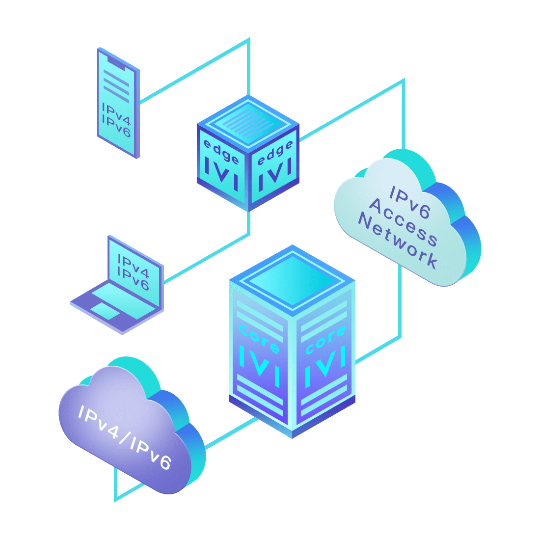 對正在進行IPv6整體升級規劃的運營商,應用IPv6升級方案2.5,通過IVI無狀態翻譯技術和純IPv6接入網絡,為雙??蛻舳撕碗p棧服務器提供連通服務。